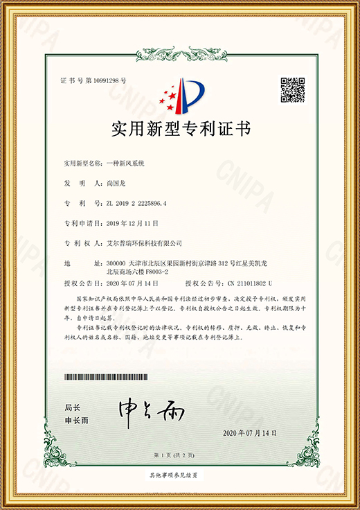 實(shí)用新型專利證書(shū)(一種新風(fēng)系統(tǒng))