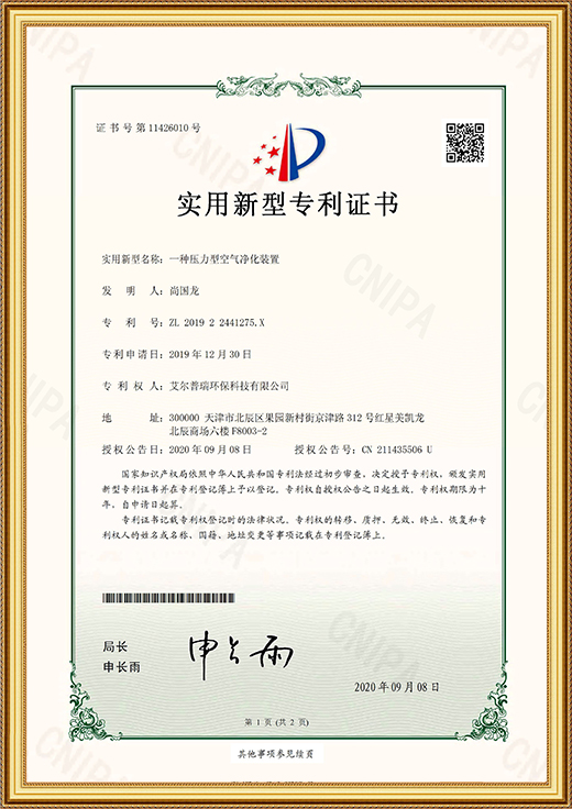 實(shí)用新型專利證書(shū)(一種空氣凈化產(chǎn)品生產(chǎn)裝置